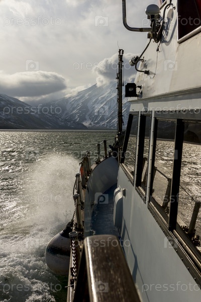 Вид с носа яхты на Камчатские горы. Солнечные лучи проникают сквозь закатные облака. Концепция летнего отдыха на море для туристических агентств