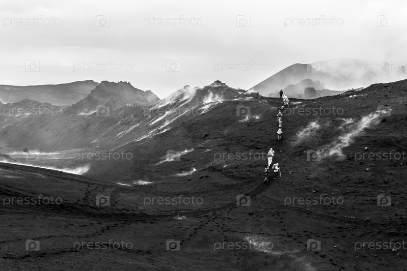 Группа туристов, гуляющих по лавовому полю у вулкана Толбачик