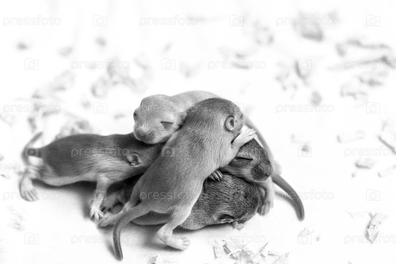 Черно-белое изображение маленьких милых мышей, спящих вместе. Вид сверху