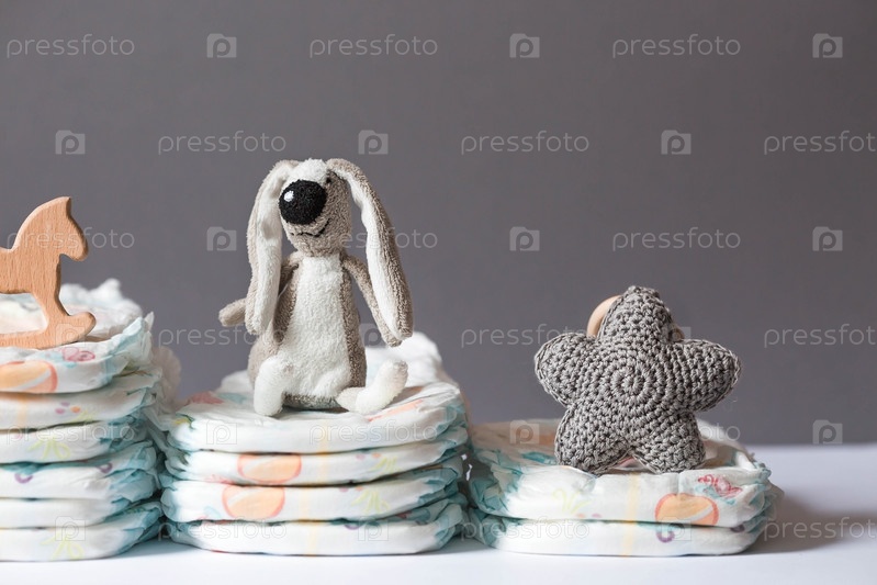 Стопка подгузников и мягких игрушек на пеленальном столике. Место для текста