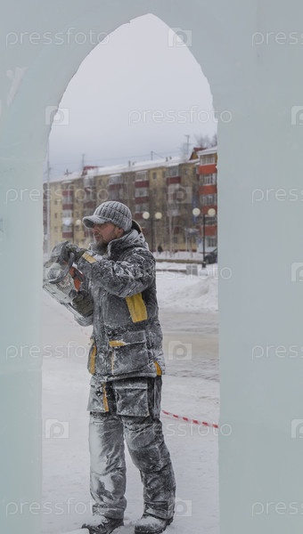 Рабочий режет лед бензиновой пилой