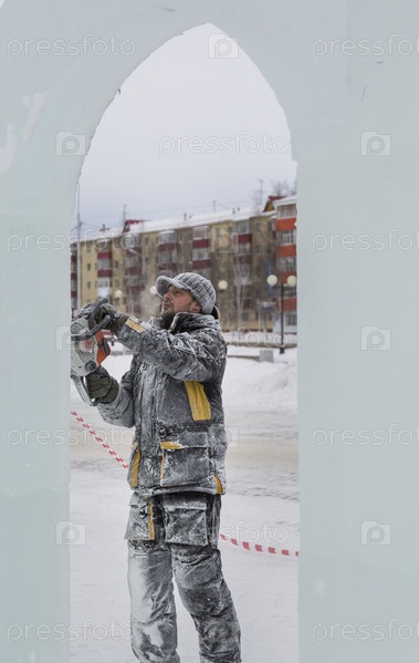 Рабочий режет лед бензиновой пилой