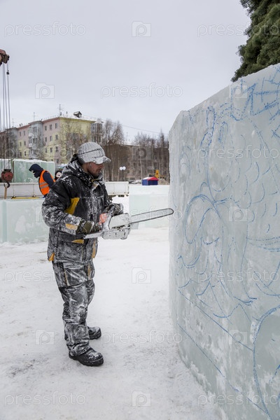 Рабочий режет лед бензиновой пилой