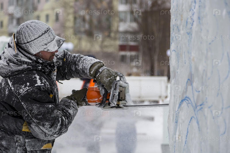 Рабочий режет лед бензиновой пилой