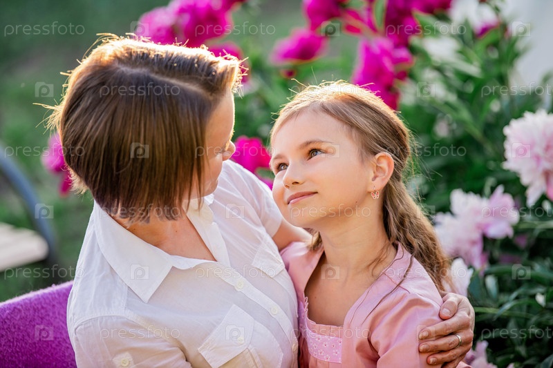 Прикладные семейные отношения. Мама и дочь сидят на скамейке и болтают в саду среди цветов солнечным летним вечером
