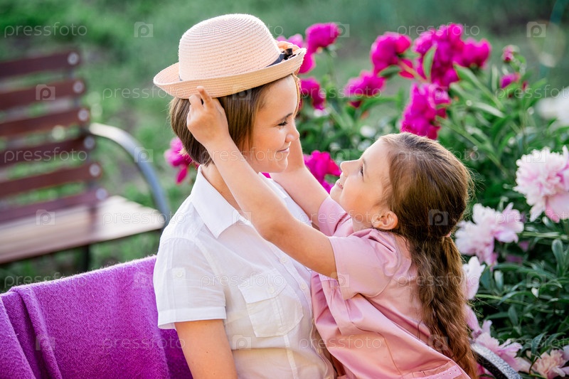 Счастливые семейные отношения. Мама и дочь сидят на скамейке и болтают в саду среди цветов солнечным летним вечером