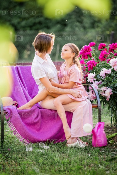 Счастливые семейные отношения. Мама и дочь сидят на скамейке и болтают в саду среди цветов солнечным летним вечером