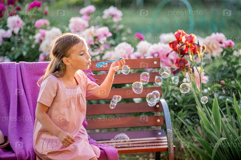 Девушка пускает мыльные пузыри на фоне цветов в саду. На лице эмоции удивления и восхищения