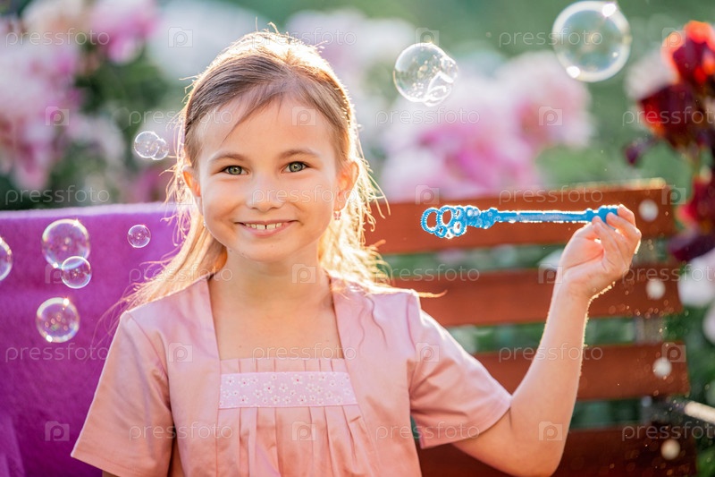 Девушка пускает мыльные пузыри на фоне цветов в саду. На лице эмоции удивления и восхищения