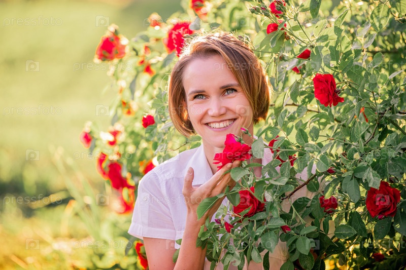 Портрет молодой женщины среди красных роз в заднем солнечном свете