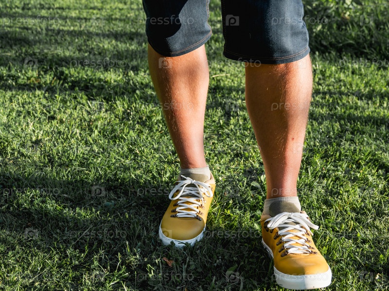 Мужчина в ярко-желтых кроссовках стоит на зеленой лужайке в парке. Обувь современного хипстера. Городская мода