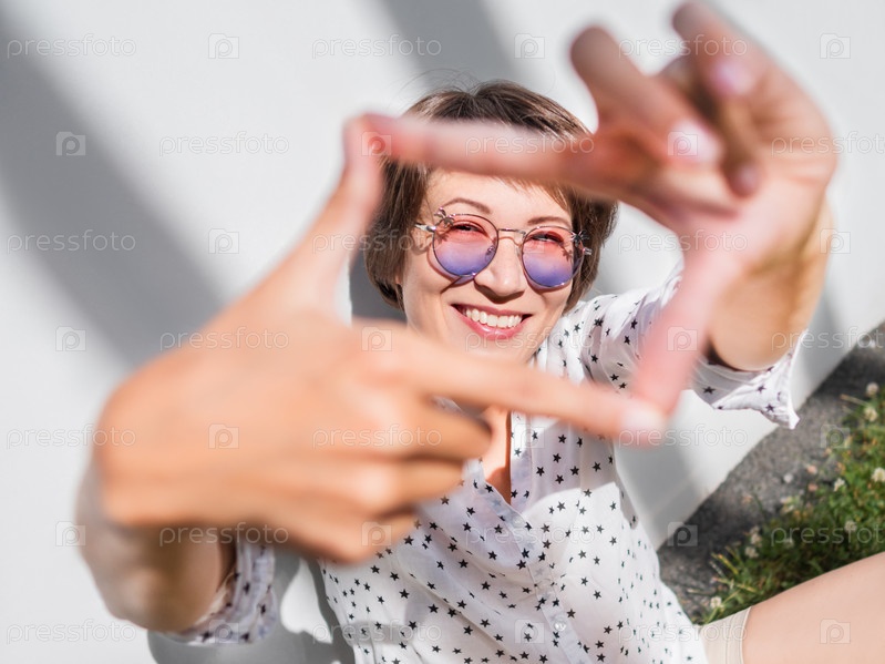 Улыбающаяся женщина в красочных солнцезащитных очках отдыхает на лужайке в городском парке. Природа в городе. Отдохните на свежем воздухе после работы. Летние вибрации