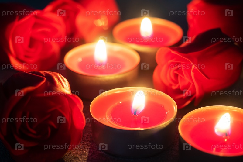 Красные розы и зажженные свечи, крупным планом, романтическая открытка. концепция Дня святого Валентина