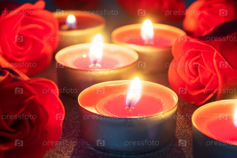 Красные розы и зажженные свечи, крупным планом, романтическая открытка. концепция Дня святого Валентина