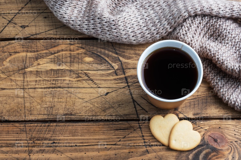 Черный кофе в бумажном стаканчике и печенье в форме сердец на деревянном фоне. плоское пространство для копирования, вид сверху
