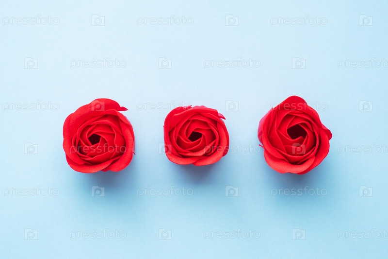 Мыло ручной работы в форме розы, красный цветок розы на синем фоне. Вид сверху, минималистский, пространство для копирования
