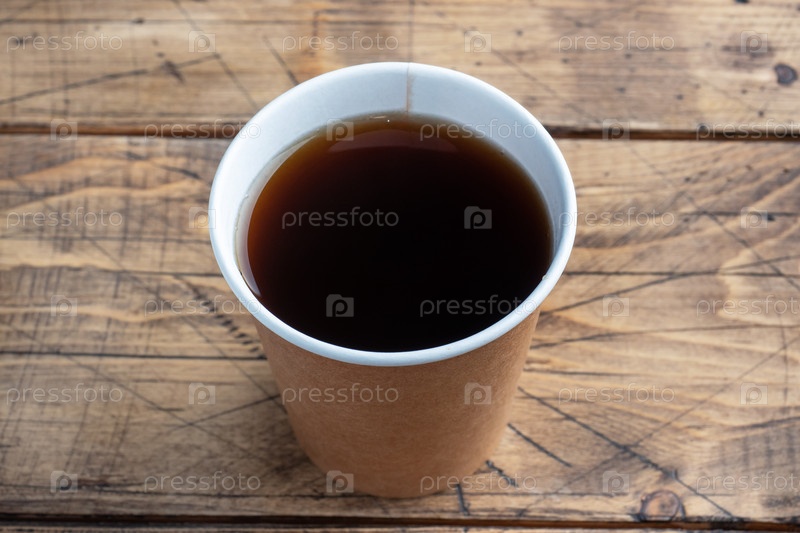 Черный кофе в бумажном стаканчике на деревянном фоне. плоское пространство для копирования, вид сверху