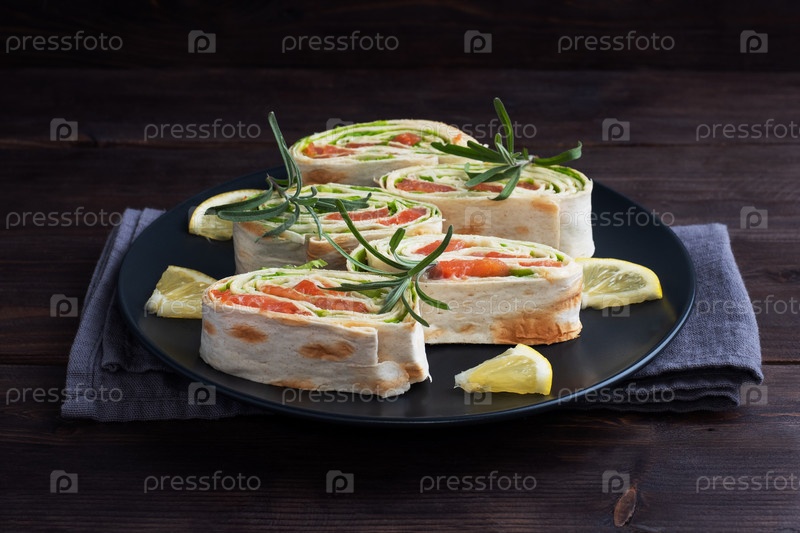 Рулеты из тонкого лаваша и красного соленого лосося с листьями салата на черной керамической тарелке, темный деревянный фон. Скопируйте пространство