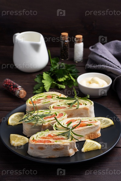 Рулеты из тонкого лаваша и красного соленого лосося с листьями салата на черной керамической тарелке, темный деревянный фон. Скопируйте пространство