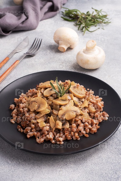 Отварная гречка с тушеными грибами. Русская традиционная еда. Здоровое диетическое питание