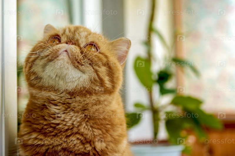 Оранжевая экзотическая короткошерстная взрослая кошка сидит на балконе. Домашняя кошка смотрит из окна на улицу
