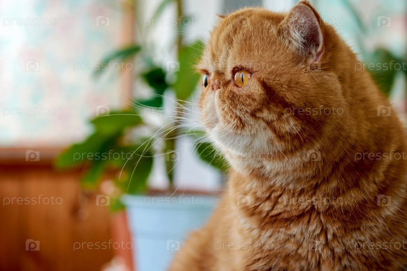 Оранжевая экзотическая короткошерстная взрослая кошка сидит на балконе. Домашняя кошка смотрит из окна на улицу
