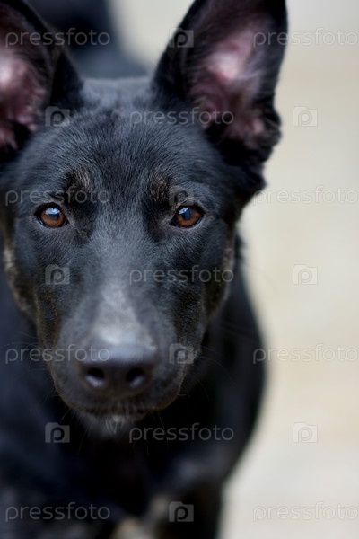 Портрет грустной черной собаки. Акцент на карие глаза. Концепция приюта для животных, одиночество
