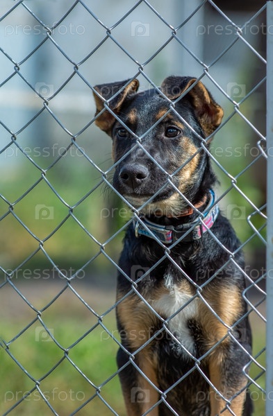 Портрет щенка за забором. Сосредоточьтесь на карих глазах. Концепция охраны дома и территории