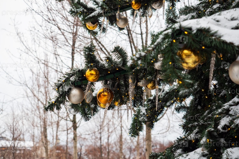 Рождественские украшения на елках в городском парке