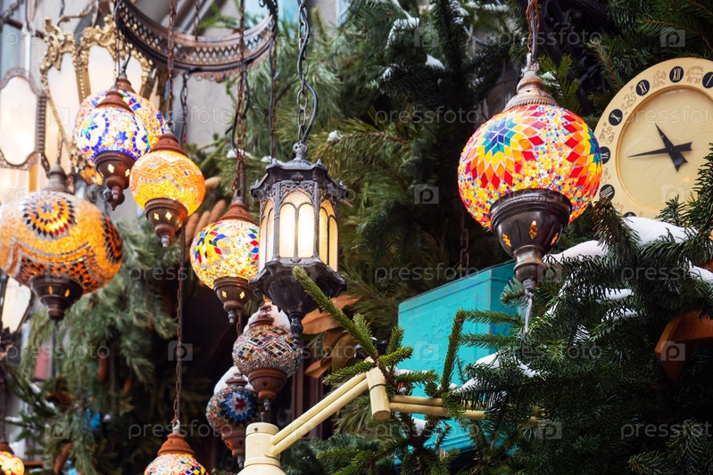 Восточные яркие светильники. Мозаика из цветного стекла освещает новогодние украшения города. Декоративное искусство Востока