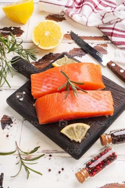 Филе лосося, красная соленая рыба на деревянной разделочной доске. Лимон, розмарин, специи