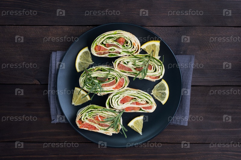 Рулеты из тонкого лаваша и красного соленого лосося с листьями салата на черной керамической тарелке, темный деревянный фон. Скопируйте пространство
