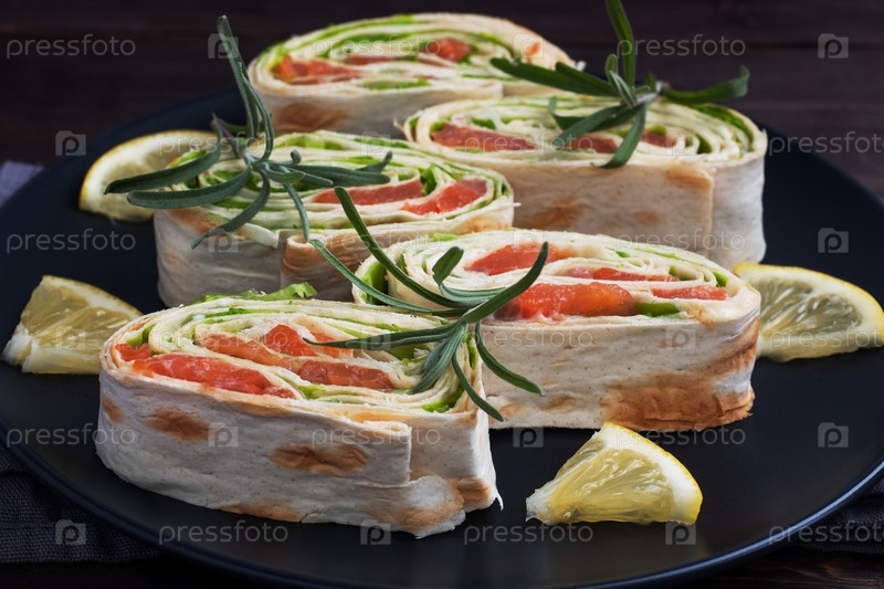 Рулеты из тонкого лаваша и красного соленого лосося с листьями салата на черной керамической тарелке, темный деревянный фон
