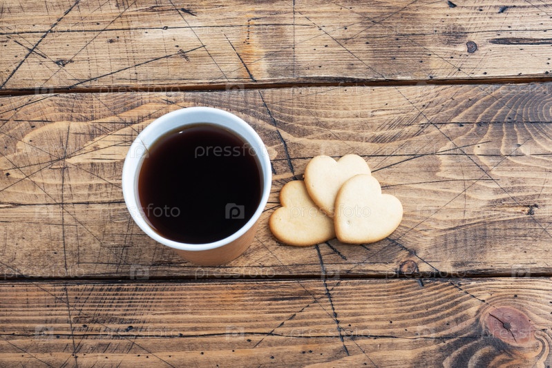 Черный кофе в бумажном стаканчике и печенье в форме сердец на деревянном фоне. плоское пространство для копирования, вид сверху