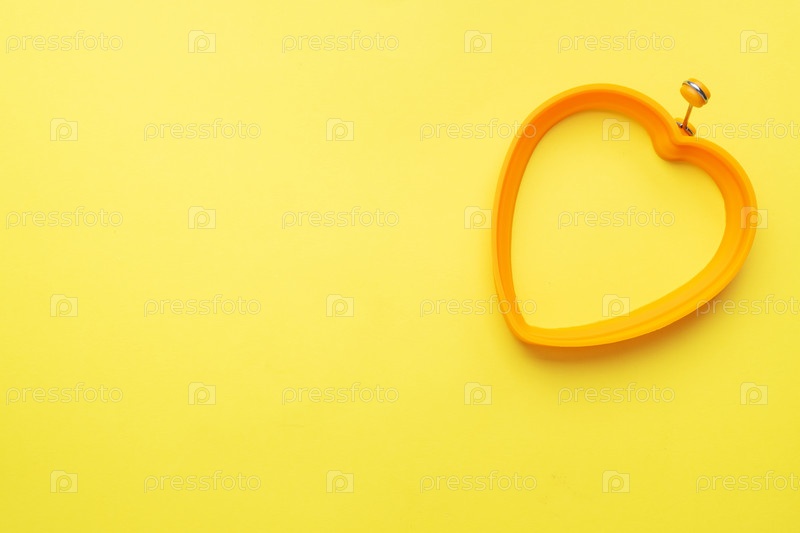 Силиконовая форма в форме сердца для выпечки и жарки яиц на желтом фоне. Вид сверху, минималистский, пространство для копирования