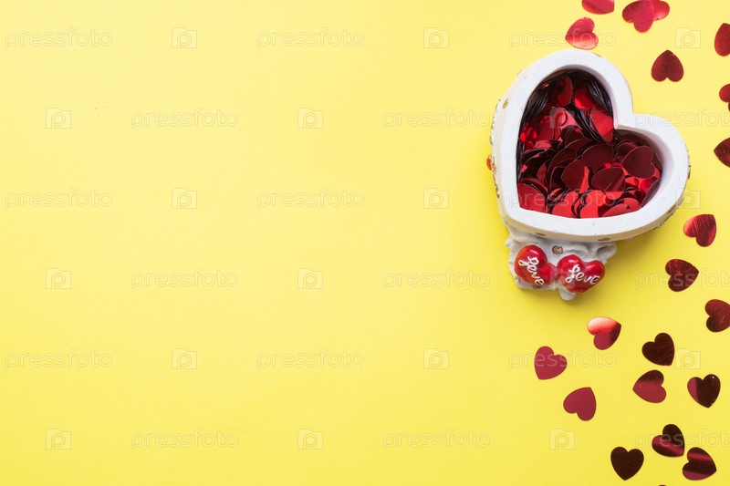 Конфетти красные сердца в керамической подставке в форме сердца на желтом фоне. Праздничная открытка на День святого Валентина. Плоская укладка