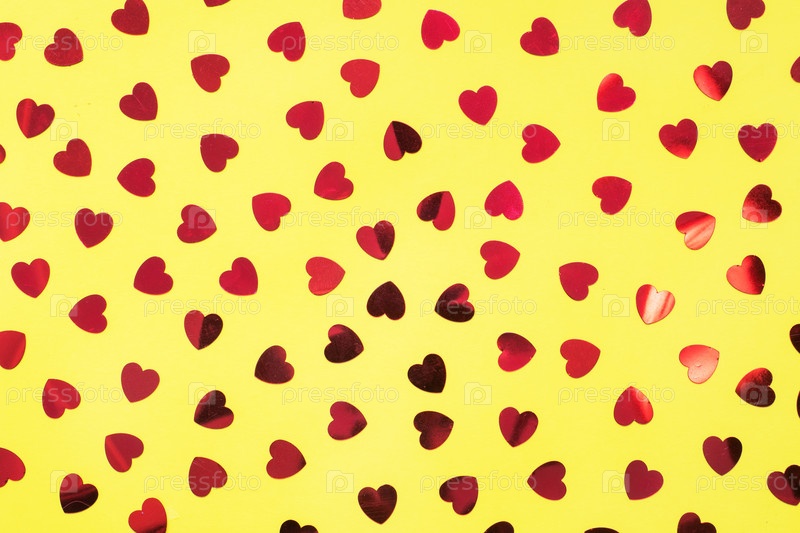 Праздничный фон с красными сердцами конфетти на желтом. Закрыть вид сверху Концепция Дня святого Валентина