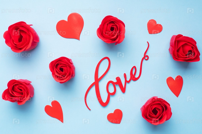 Слово Любовь и красные сердца розы на синем фоне, вид сверху. Праздничная открытка на День святого Валентина. Плоская укладка