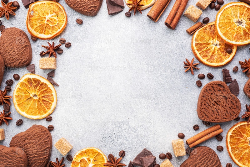 Печенье с шоколадным сердцем, апельсины, корица и острые специи на сером столе, вид сверху, пространство для копирования