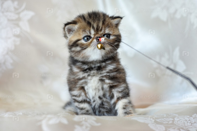 Красивый забавный полосатый котенок экзотической короткошерстной породы ловит игрушку. Дизайн-концепция детского фонда и домашнего уюта