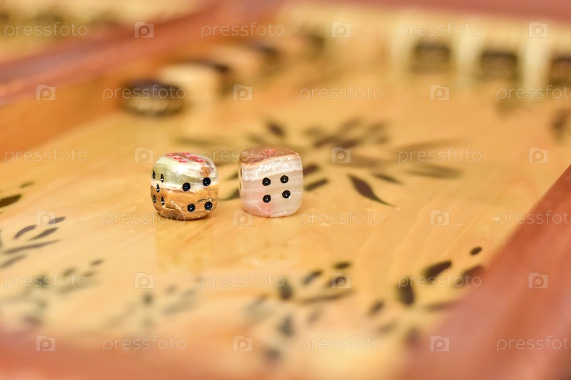 Белые кости на доске для игры в нарды. Концепция победы и домашних игр
