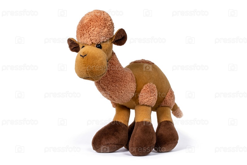 Мягкая верблюжья игрушка коричневого цвета для детей на белом фоне
