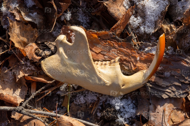 Старая часть черепа животного бобра лежит на земле в лесу, сброшенная с сосны иглами