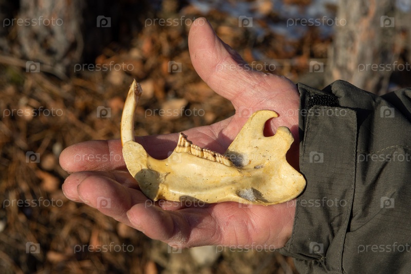 Старая часть черепа животного бобра лежит на руке лесника, находка в иголках, упавших с сосны