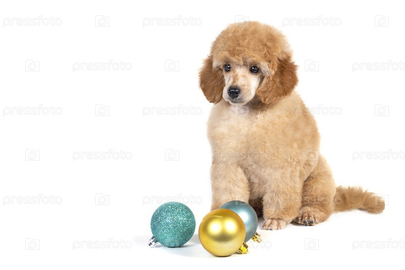 Рождественский пудель на белом фоне со стеклянными игрушками для елки. Концепция зимы и праздника