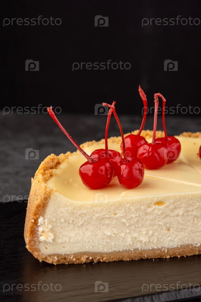 Классический чизкейк, украшенный вишней на темном фоне
