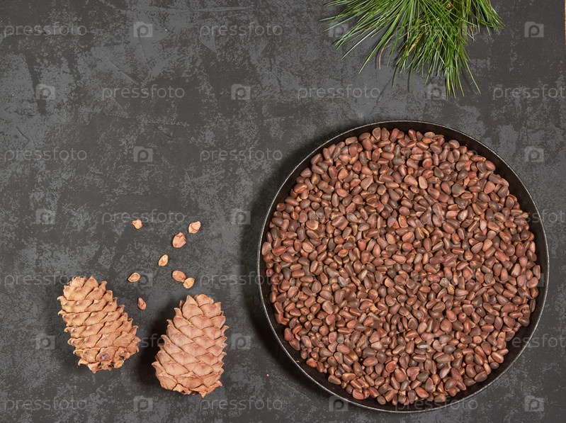 Сосновые шишки и орехи в сковороде на темном фоне с местом для копирования, вид сверху