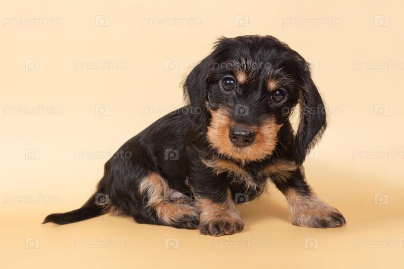 Маленький жесткошерстный щенок таксы на светлом фоне. Портрет собаки