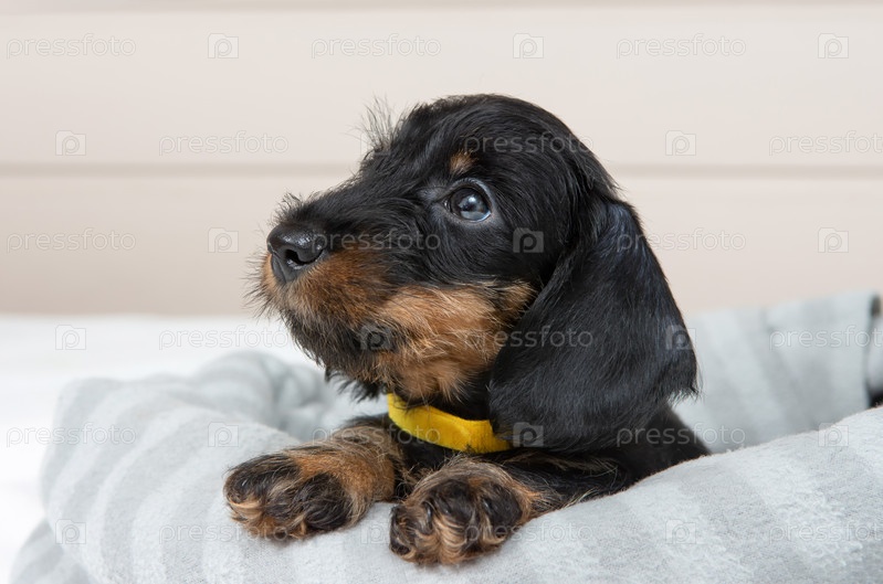 Маленький жесткошерстный щенок таксы лежит на кровати. Портрет собаки