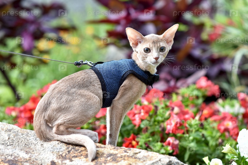 Молодой абиссинский кот окраса Фавн с поводком гуляет по двору. Милый кот в упряжке сидит на лужайке. Прогулки с питомцами на свежем воздухе, приключения на зеленой траве в парке